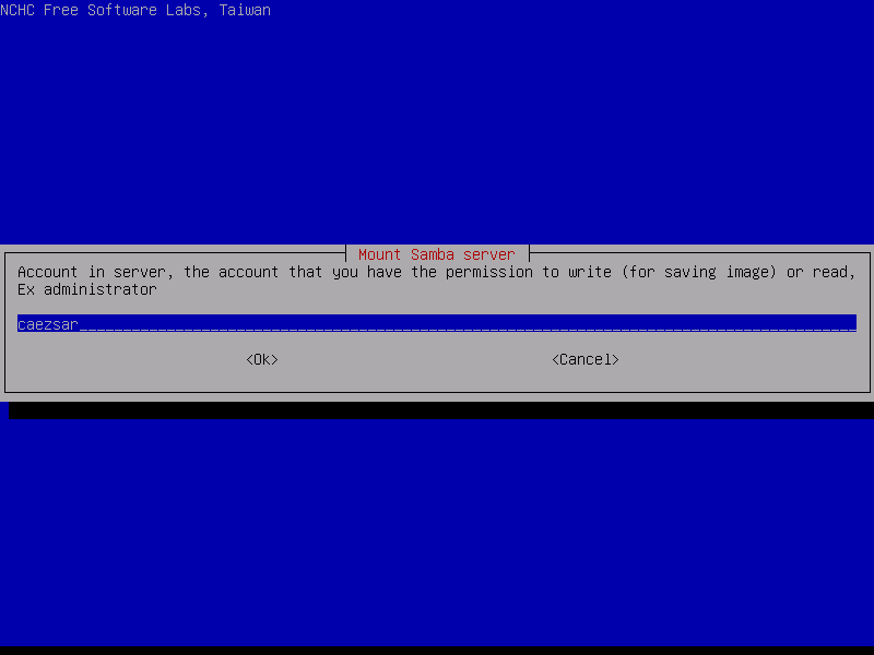 12. On the next screen add the name of a samba server account with write privileges on the server and press [enter] key to move forward.