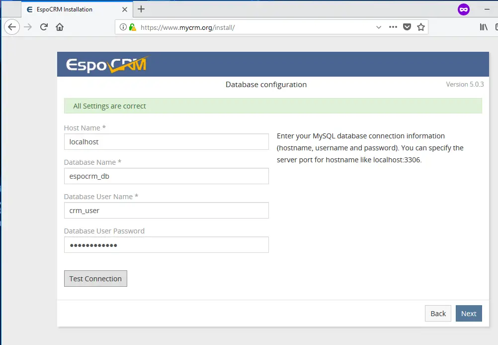 In the next installation screen, setup MySQL database connection settings. Supply MySQL database host address (127.0.0.1 or localhost), the database name, username and the password configured for EspoCRM application. After completing all required database fields, hit on Next button to move to the next installation step. Use the below screenshot as a guide to complete this step.