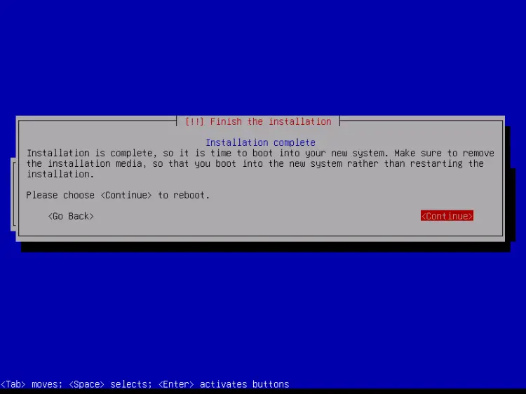 The base system installation is now finished. Remove the Debian Netinstall CD from the CD drive and hit Continue to reboot the system: