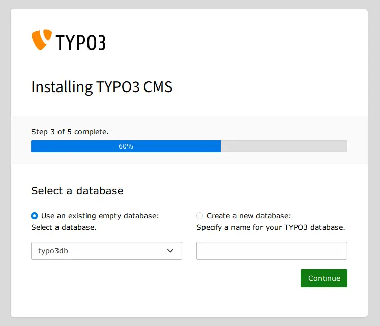 Select the option Use existing empty database and select the database typo3db. Then, click Continue again.