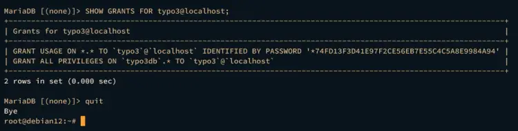 An output below confirms that the MariaDB user typo3 can access the database typo3db.