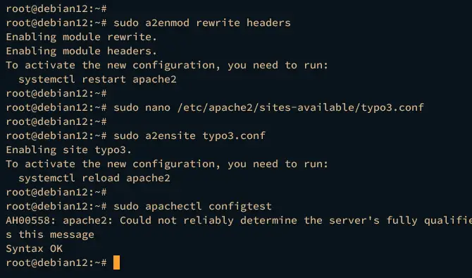 Next, run the command below to activate the new virtual host file typo3.conf and verify your Apache2 syntax.
