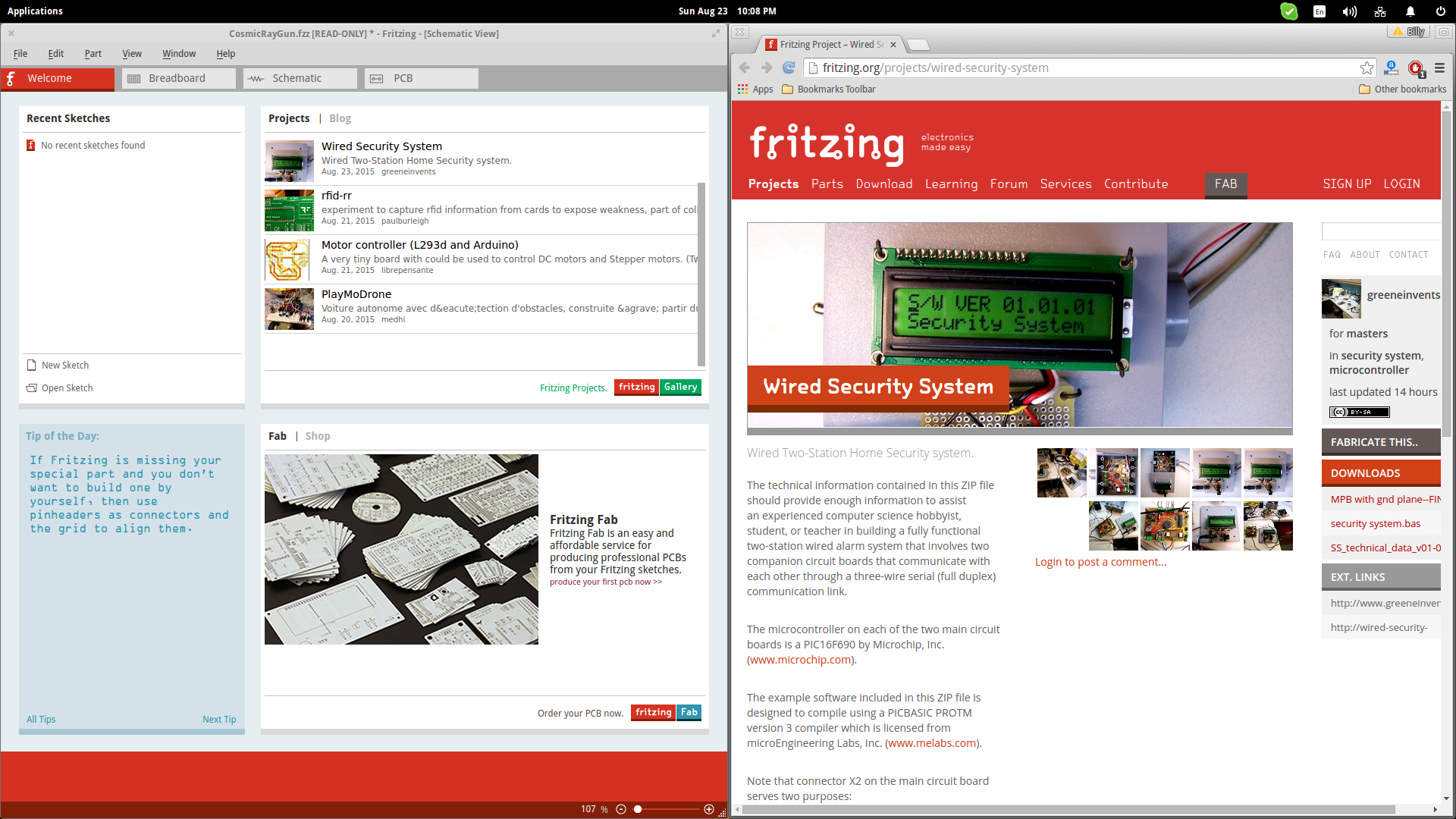 If you need some push to begin with Fritzing, you can open an example from the rich list of examples that the software comes with by default from “File/Open Example”. For further help, you can press “Ctrl+?” and a list of detailed step-by-step tutorials on various different projects will open up in your browser. Fritzing has built a vivid community of users around it who upload their designs and even custom-made parts, so you can hop to the “Welcome” screen and check out the latest projects or blog entries that will help you stay updated on what's going on.