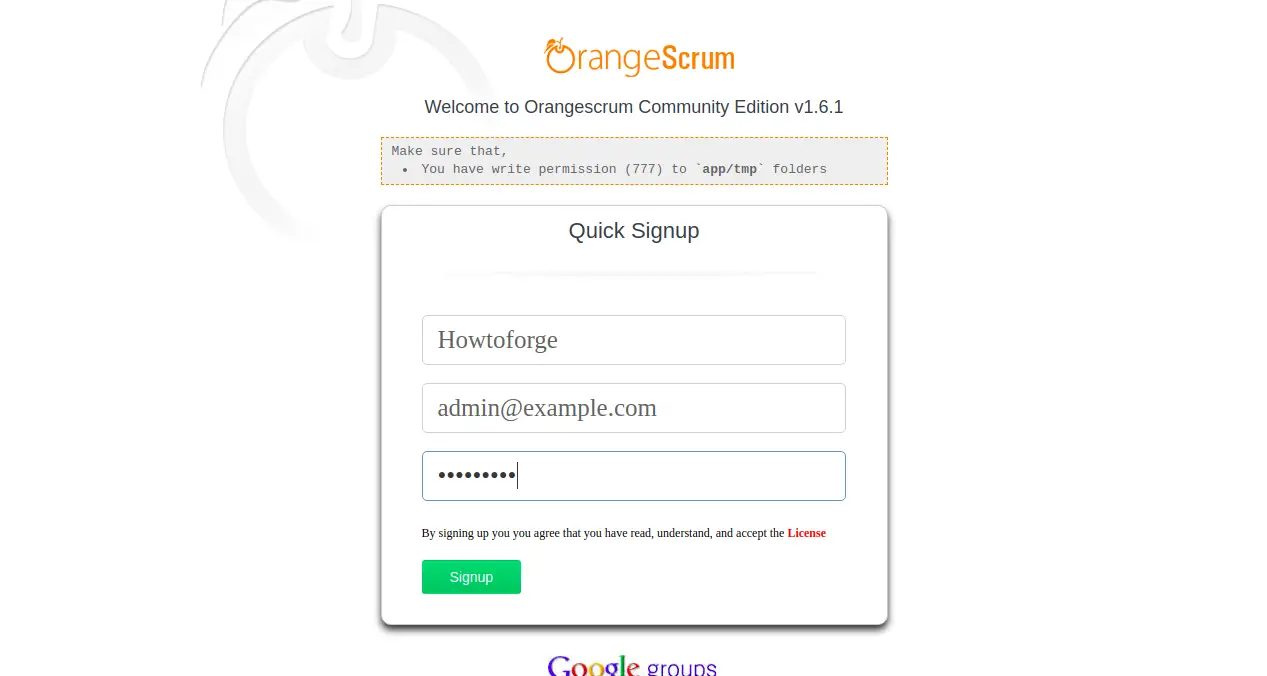 Now, open your web browser and type the URL http://example.com. You will be redirected to the Orangescrum welcome page: