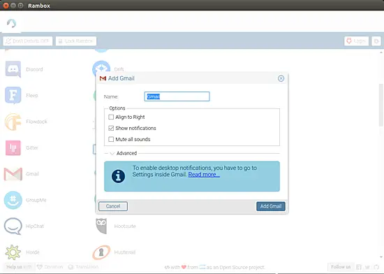 And as far as user privacy is concerned, here's what the developer says: "No personal information will be saved. Sessions will persist using the partition:persist attribute for Webviews. So every time you open Rambox, your sessions will keep alive until you remove the service. Sync feature use Auth0 for Single Sign On & Token Based Authentication with the integration with Firebase to store the services that user is using (and the configuration for each service). You are always welcome to check the code!".