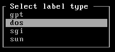 Once done, partition the disk. Unless your motherboard is using UEFI firmware, make sure to select 'dos' (msdos) label, otherwise go with the 'gpt' when you type: