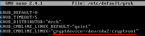 cryptsetup --verbose --cipher aes-xts-plain64 --key-size 512 --hash sha512 --iter-time 5000 --use-random luksFormat /dev/sda2