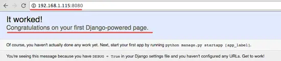 Open your web browser and visit the server IP address on port 8080, in my case http://192.168.1.115:8080. You will see the Django default page.
