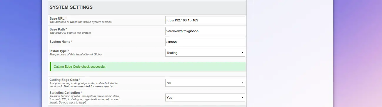 In the account configuration, system settings and organization settings, provide all the necessary information and click on the Submit button. After Gibbon installed successfully you should see the following page: