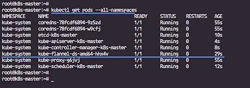 And you will get the 'k8s-master' node is running as a 'master' cluster with status 'ready', and all 'kube-system' pods that are needed for the cluster is up and running.