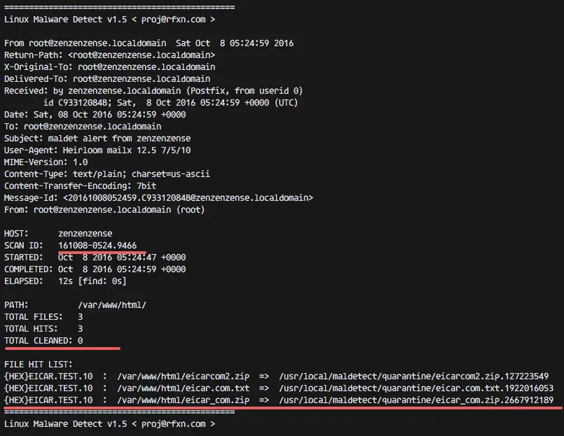 You can see that LMD is using the ClamAV scanner engine to perform the scan, and there are 'malware hits 3' and the malware files were automatically moved to the quarantine directory.
