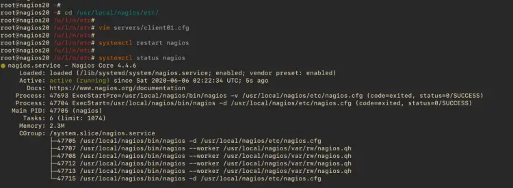 Back to the Nagios server terminal, go to the "/usr/local/nagios/etc" directory and create a new configuration "server/client01.cfg".