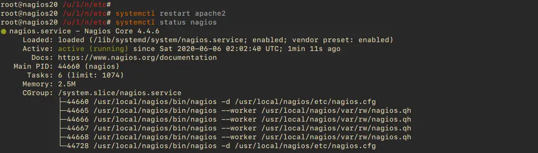 As a result, the Nagios service is up and running. Now we need to restart the Apache service to apply a new Nagios configuration.