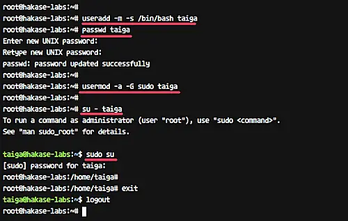 In this step, we will create a new system user named 'taiga', and then add it to the sudo group.