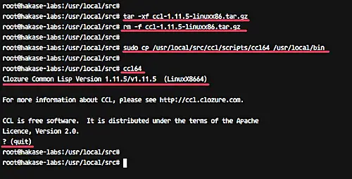 'Clozure Common lisp' has now has been installed. And if you want to exit from the 'ccl' shell, type the quit command as below.