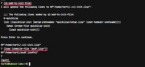 Now load 'quicklisp.lisp' using the 'ccl64' command as shown below.