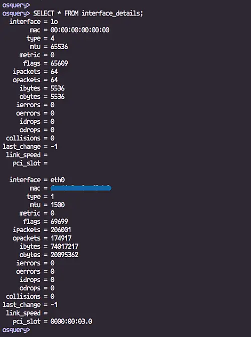 SELECT interface, mac, ipackets, opackets, ibytes, obytes FROM interface_details;