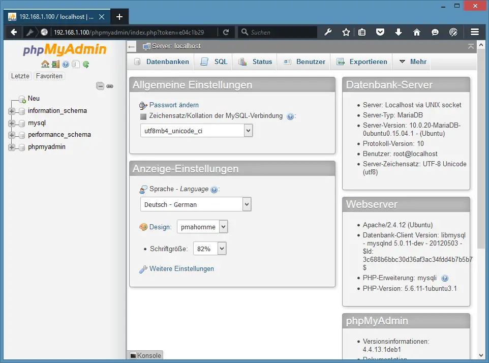 Afterward, you can access phpMyAdmin under http://192.168.1.100/phpmyadmin/:
