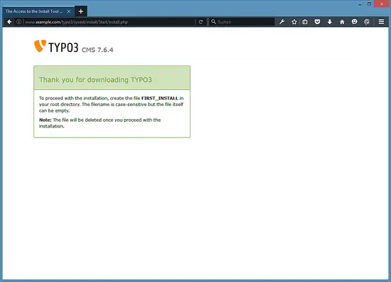 Now we can launch the web-based TYPO3 installer by going to http://www.example.com/ - you will be prompted to create the file FIRST_INSTALL in the document root first so that the installation can proceed:
