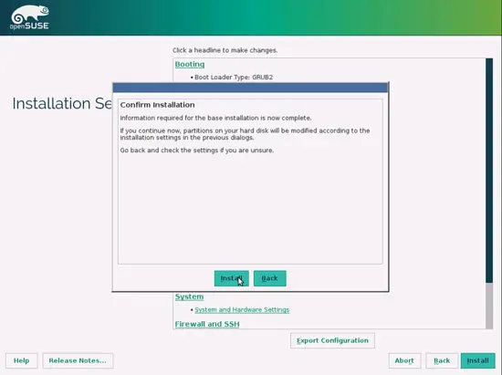 Before the actual installation begins, the installer displays a summary of your settings. If the settings are ok, click on the Install button: