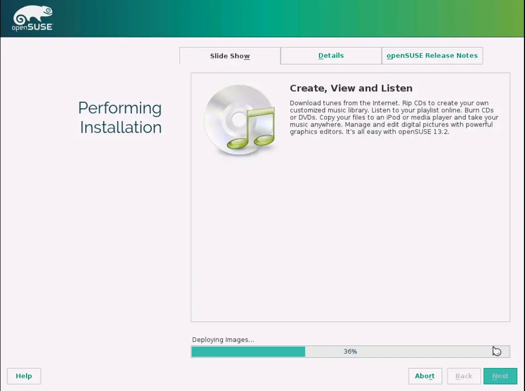An OpenSUSE 13.2 image with default settings is now being copied to the hard drive & installation continues: