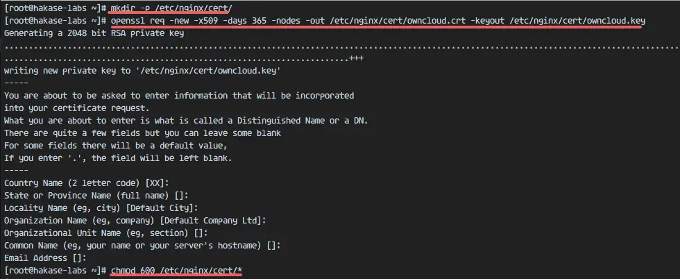 openssl req -new -x509 -days 365 -nodes -out /etc/nginx/cert/owncloud.crt -keyout /etc/nginx/cert/owncloud.key