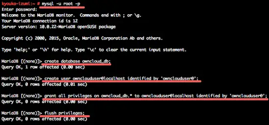 grant all privileges on owncloud_db.* to ownclouduser@localhost identified by 'ownclouduser@';