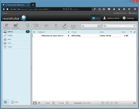 That's it, RoundCube is now fully installed on your server, and you can reach it on the server IP and hostname trough the aliases /roundcube and /webmail. The IP of my server is 192.168.1.100; for that I can open RoundCube with http://192.168.1.100/webmail