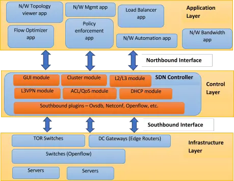 Since SDN controller is for managing networks, so it must have control logic for real world network use-cases like switching, routing, L2 VPN, L3 VPN, firewall security rules, DNS, DHCP, and clustering. Several networking vendors and even open source communities are working on the implementation of these use-cases in their SDN controllers. Once they get implemented, these services expose their APIs (typically REST based) to the upper layer (Application layer), something which makes life easy for network administrators who then use apps on top of SDN controllers to configure, manage and monitor underlying network. Control layer lies in middle and it exposes two types of interfaces – Northbound and Southbound.
