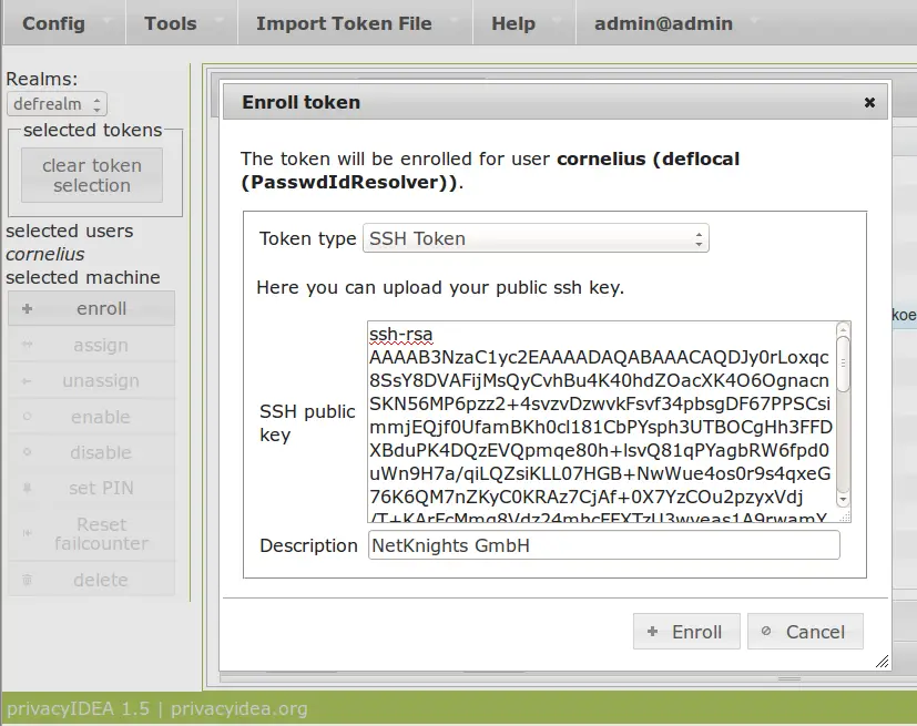Then click the button Enroll and select the type SSH Token and copy-and-paste the SSH public key.