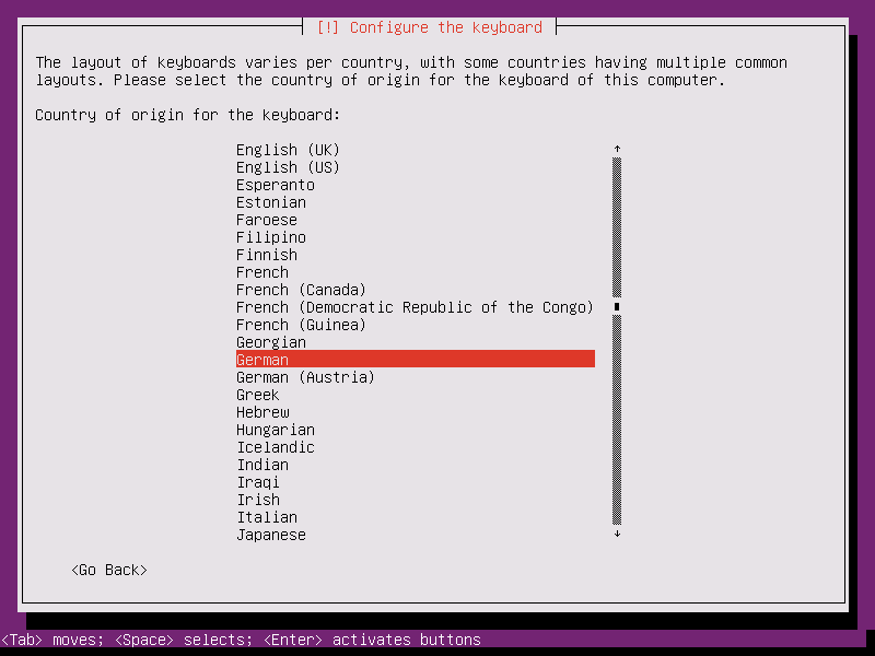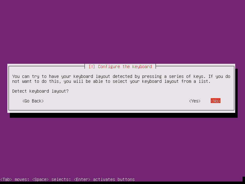 Choose a keyboard layout: You have the option to let the Ubuntu installer detect the keyboard layout automatically by choosing "yes" here. I prefer to select the right keyboard from a list and therefore I choose No & keyboard layout as German: