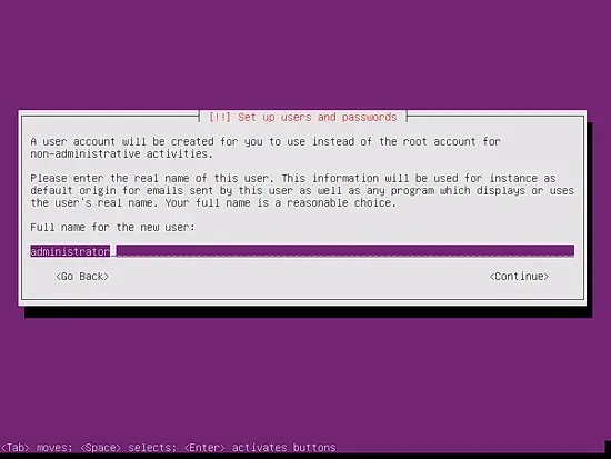 Ubuntu does not let you log in as root user directly. Therefore, we create a new system user here for the initial login. I will create a user with the name Administrator and user name administrator (don't use the user name admin as it is a reserved name on Ubuntu Linux):