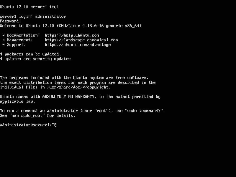 Now Login on the shell (or remotely by SSH) on the server as user "administrator". The username may differ if you have chosen a different name during setup.