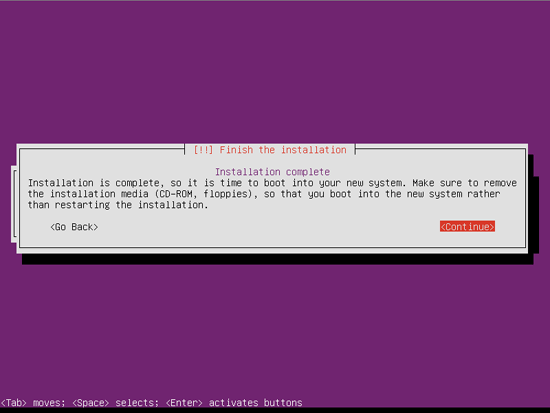 There, first part done. Press Continue to reboot the machine. Remove media from your CD-Rom device or unmount it if you are using VM.
