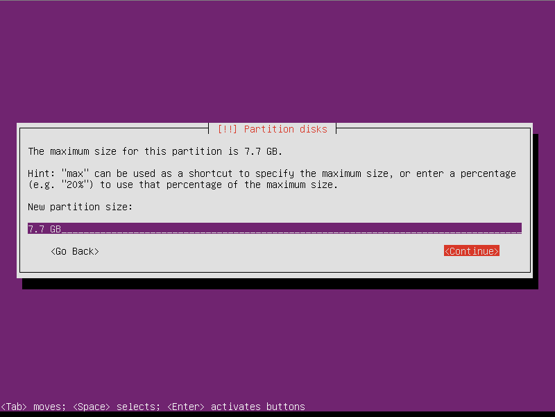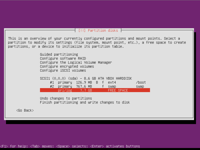 - Since I have small virtual disk (8 GB), I'm using what's left of space after creating /boot and swap partitions for root partition. Of course if you are installing this ona a real machine with a large disk, I recommend you create an 8 GB (max. 15 GB) root partition, and use rest to create fourth physical partition with mount point on /home or /media/storage, or create logical partition and add several more extended partitions on it. It's your choice.