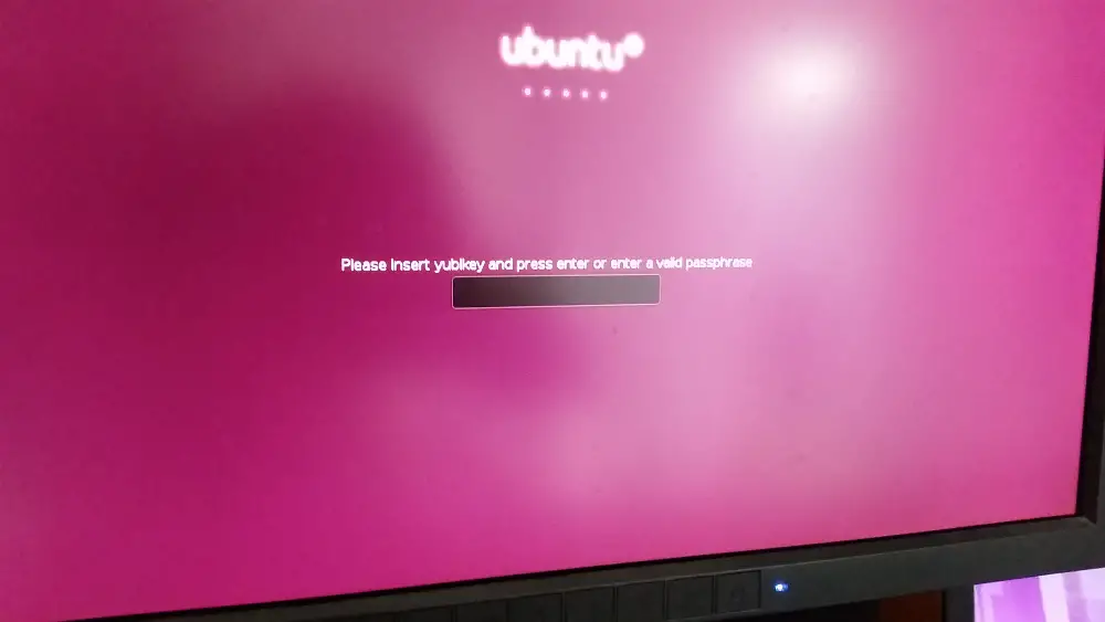 The boot screen welcomes you with the hint, to insert the yubikey. You can as well use old passphrases...