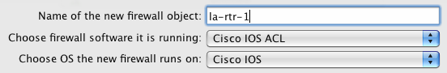 Enter a name for the firewall object, in this example we will use la-rtr-1. Change the drop down menu for software that is running on the firewall to be "Cisco IOS ACL".