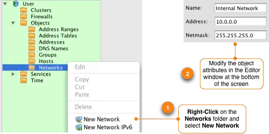 To create the object that will represent our internal 10.0.0.0/24 network in the left hand tree double-click the folder labeled Objects to expand it. Right click on the folder called Networks and select "New Network". This creates a new network object. In the lower portion of your screen, called the Editor Panel, you can modify the properties of this object.