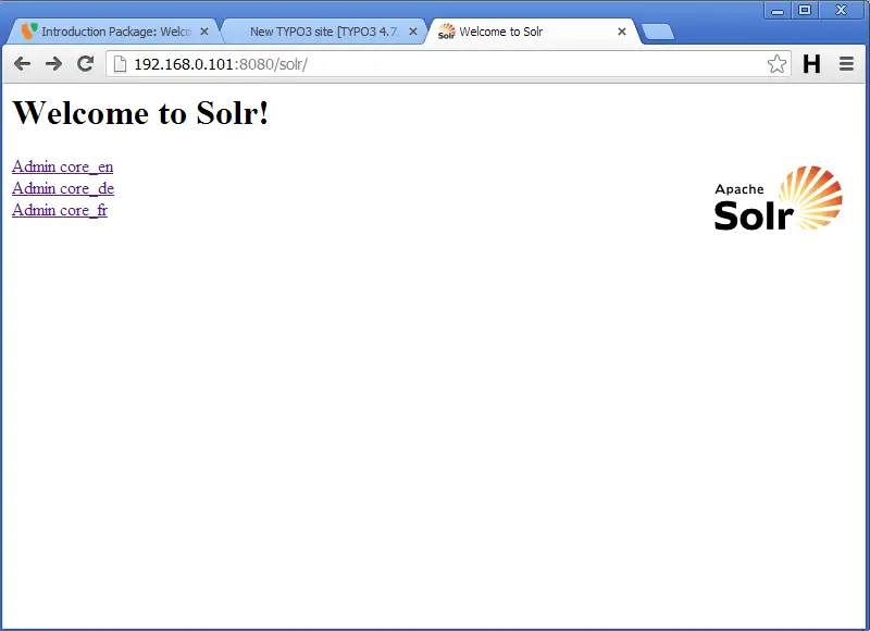 You can now open a browser and visit Solr under http://192.168.0.101:8080/solr where you should see all configured cores: