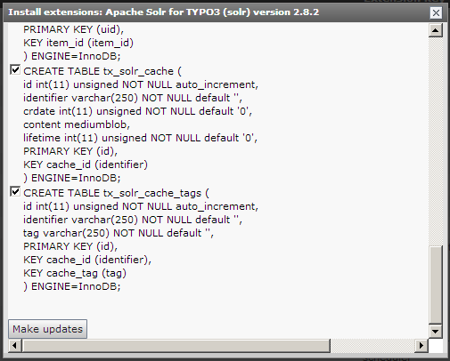 A new window pops up telling you that database changes have to be made to enable the Solr extension. Accept all proposed changes and click on the Make updates button: