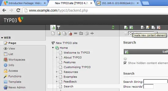 Back in the TYPO3 backend, we create a search page now so that we can use the Solr search from our TYPO3 web site. Go to the Page module and click on the Create new pages icon: