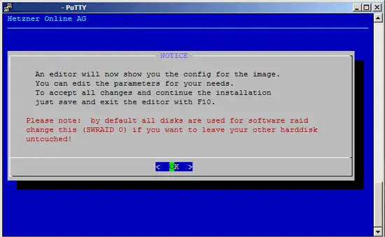 Next you will see the following message. Please note that installimage will configure software RAID unless you change the SWRAID parameter to 0: