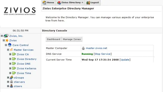 Click on the "+" next to "Zivios" to expand the tree. Continue to expand "Core Control" and "Master Services". The services you see listed under Master Services are labeled as Zivios Core modules. These include Zivios CA (certificate authority), Zivios Directory (OpenLDAP Management), Zivios DNS (Domain Name Service), Zivios Kerberos and Zivios Time.
