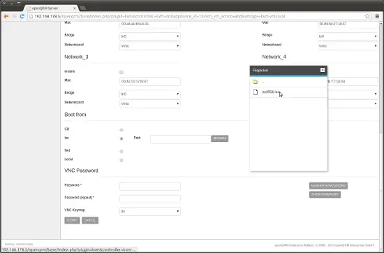 Further down the VM add form please configure the boot sequence of the VM. Select 'iso' and open the Filepicker by clicking on the 'Browse' button. This will open a small new window listing the filesystem of the Virtualization Host. Navigate to '/linuxcoe' and select the previously created LinuxCOE automatic-installation iso iamge. Please notice that the name of the iso image may be different in your setup.