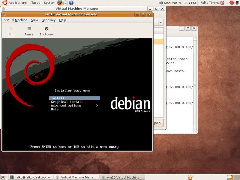 Now install Debian as you would normally do on a physical system. Please note that at the end of the installation, the Debian guest needs a reboot. The guest will then stop, so you need to start it again, either with virt-manager or like this on our CentOS 5.2 KVM host command line: