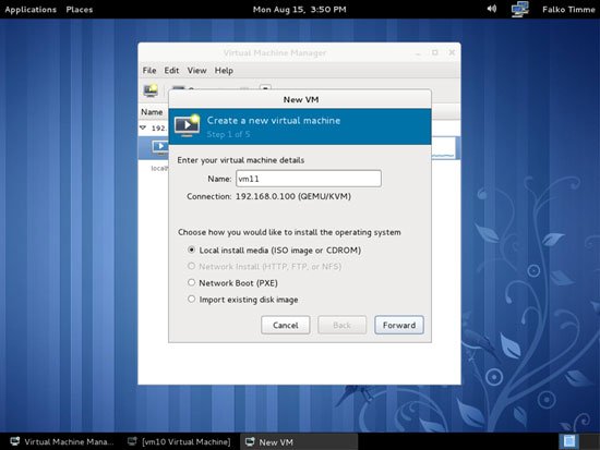 Instead of creating a virtual machine from the command line (as shown in chapter 4), you can as well create it from the Fedora desktop using virt-manager (of course, the virtual machine will be created on the CentOS 6.0 KVM host - in case you ask yourself if virt-manager is able to create virtual machines on remote systems).