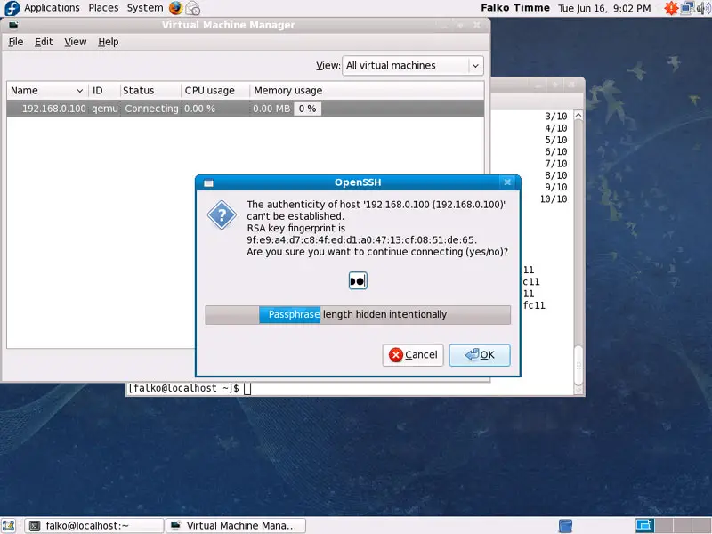 Afterwards type in the root password of the Fedora 12 KVM host:
