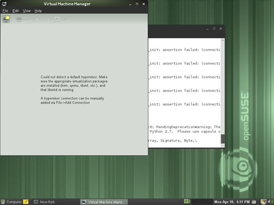 When you start virt-manager for the first time, you will most likely see the following message (Could not detect a default hypervisor.). You can ignore this because we don't want to connect to the local libvirt daemon, but to the one on our OpenSUSE 11.4 KVM host.
