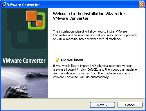 This article shows how you can convert a physical Windows system (XP, 2003, 2000, NT4 SP4+) into a VMware virtual machine with the free VMware Converter Starter. The resulting virtual machine can be run in the free VMware Player and VMware Server, and also in VMware Workstation and other VMware products. Vmware Converter comes in handy if you want to switch to a Linux desktop, but feel the need to run your old Windows desktop from time to time. By converting your Windows desktop into a virtual machine, you can run it under VMware Server/Player, etc. on your Linux desktop.